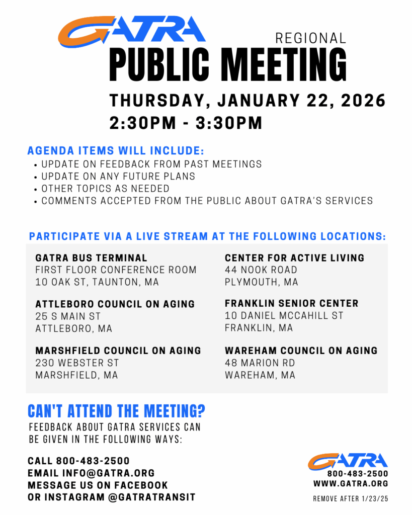 – GATRA Bus Terminal First Floor Conference room 10 Oak St, Taunton MA