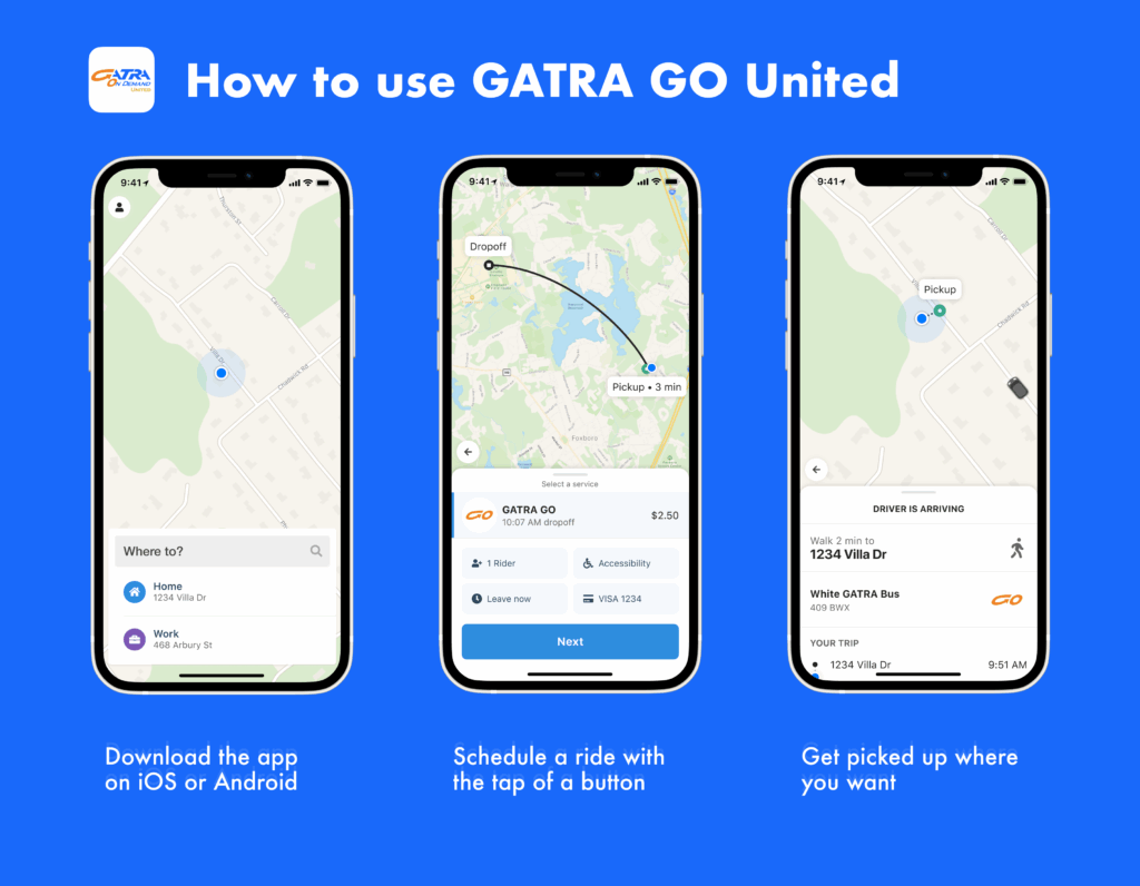 GATRA GO United is an on-demand, same day, affordable, and accessible public transit service serving the communities of Foxborough, Franklin, Mansfield, Norton, Norfolk, and Wrentham.